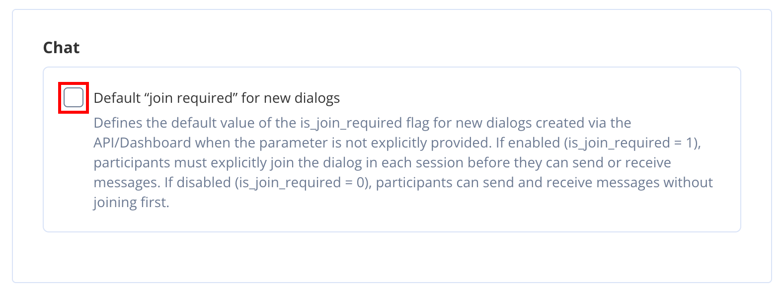Prior to server version 2.34.0, all group dialogs required participants to join before sending or receiving real-time messages. There was no configurable parameter for this behavior. Starting from server version 2.34.0, a new join required setting has been introduced in the application settings. This setting defines the default value of theis_join_required field for all newly created group dialogs within the application.