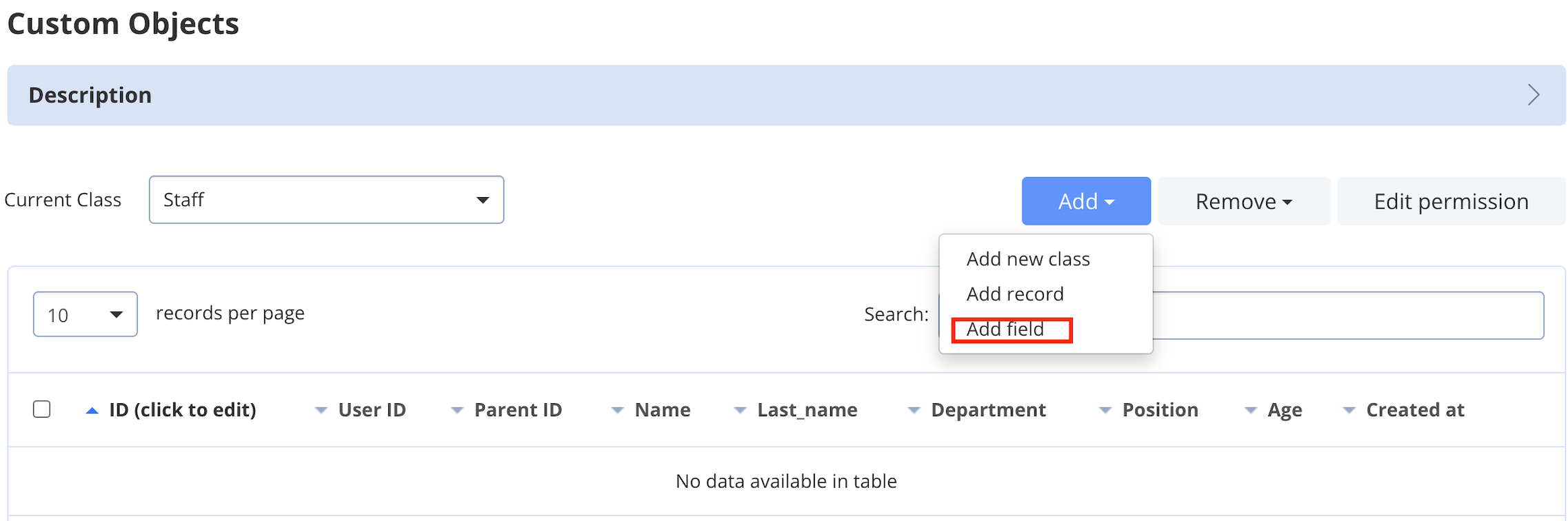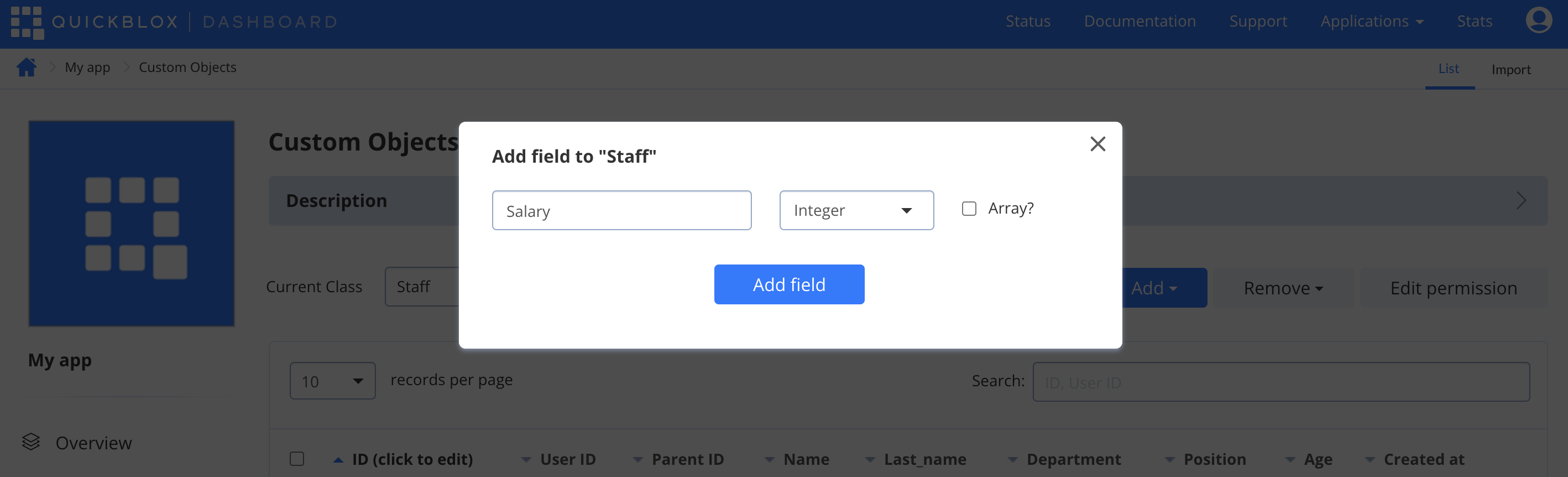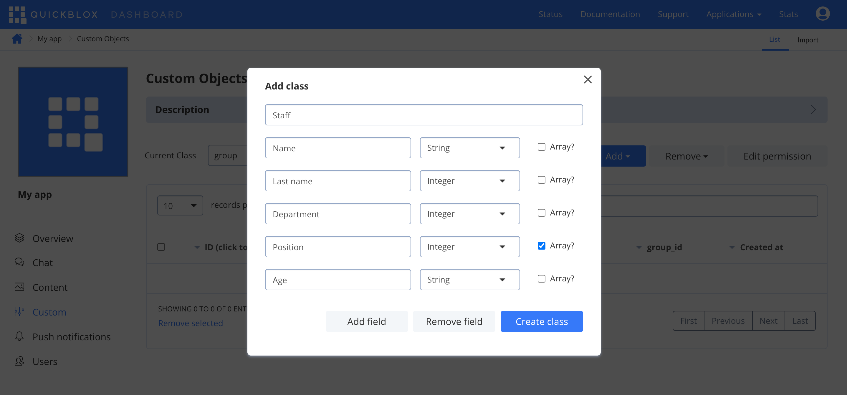 To add a field to a class, follow the steps below:- Navigate to the Dashboard => YOUR_APP => Custom page.