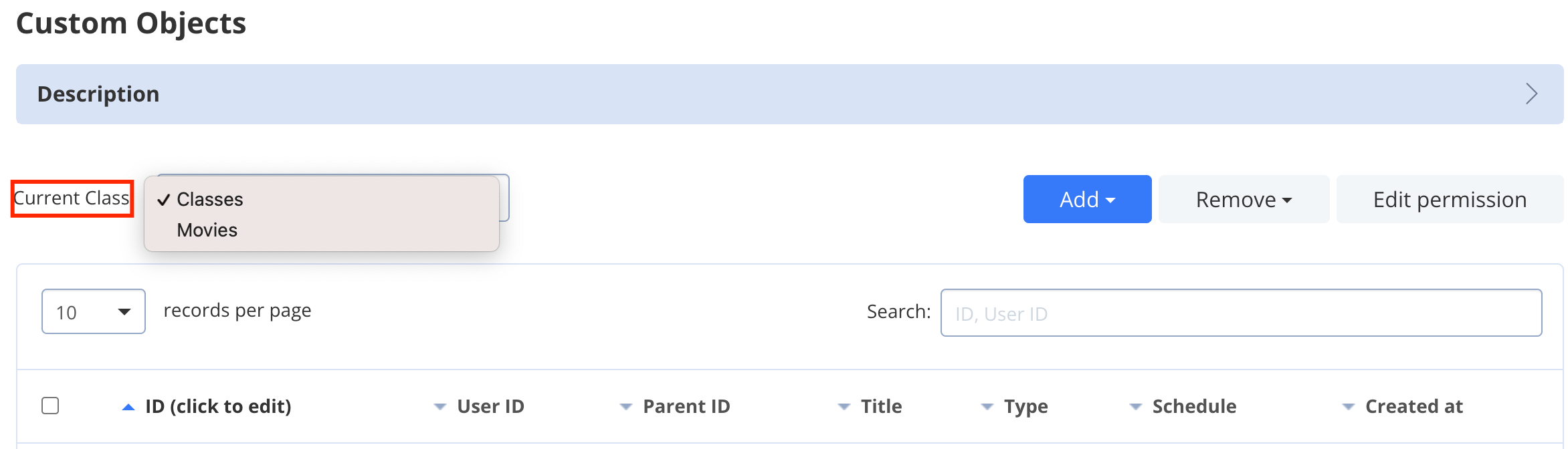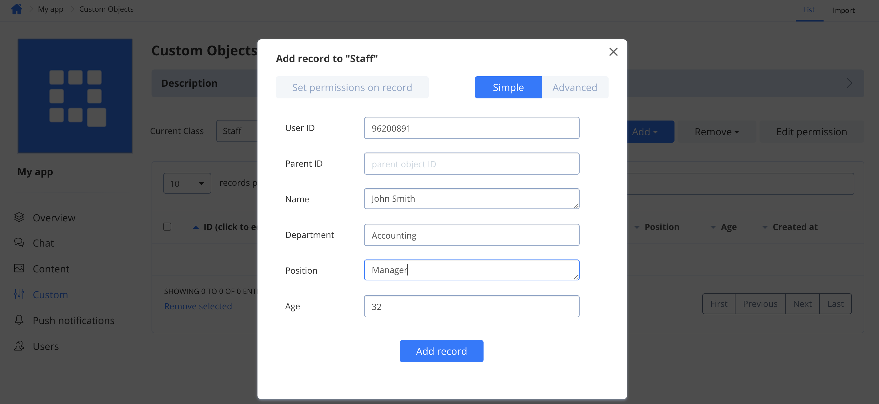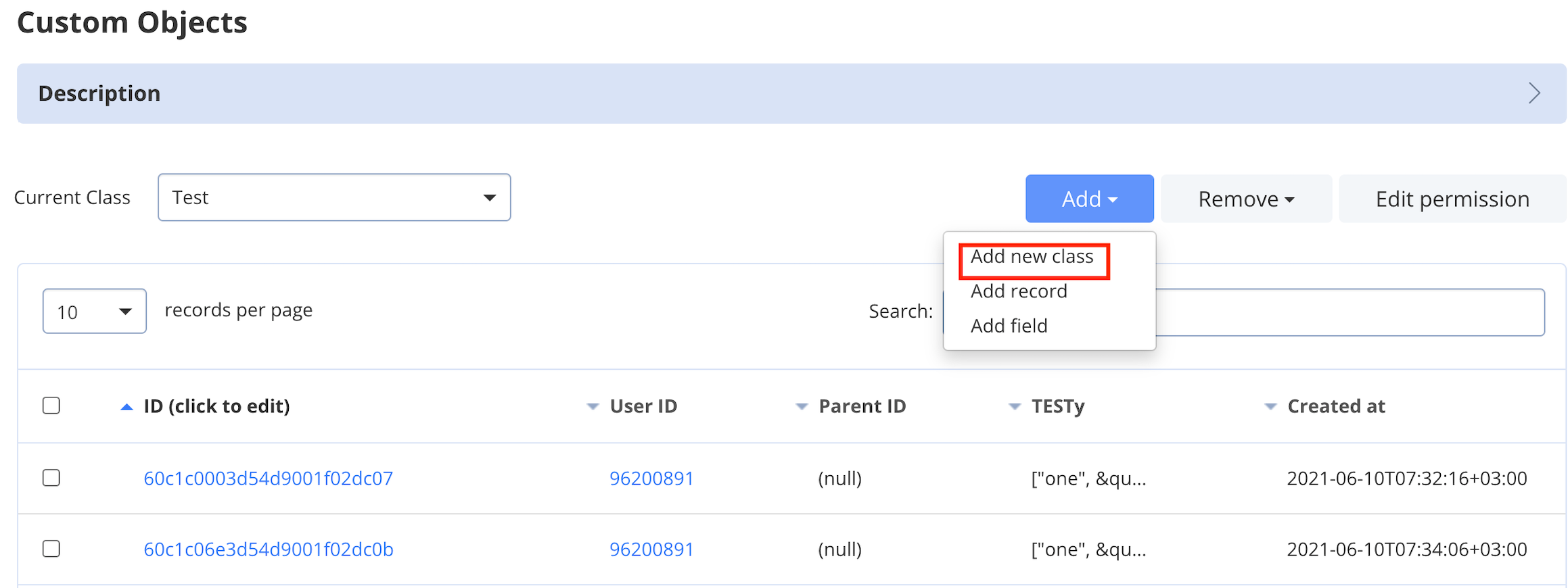 To create a custom object class, follow the steps below:- Navigate to the Dashboard => YOUR_APP => Custom page.