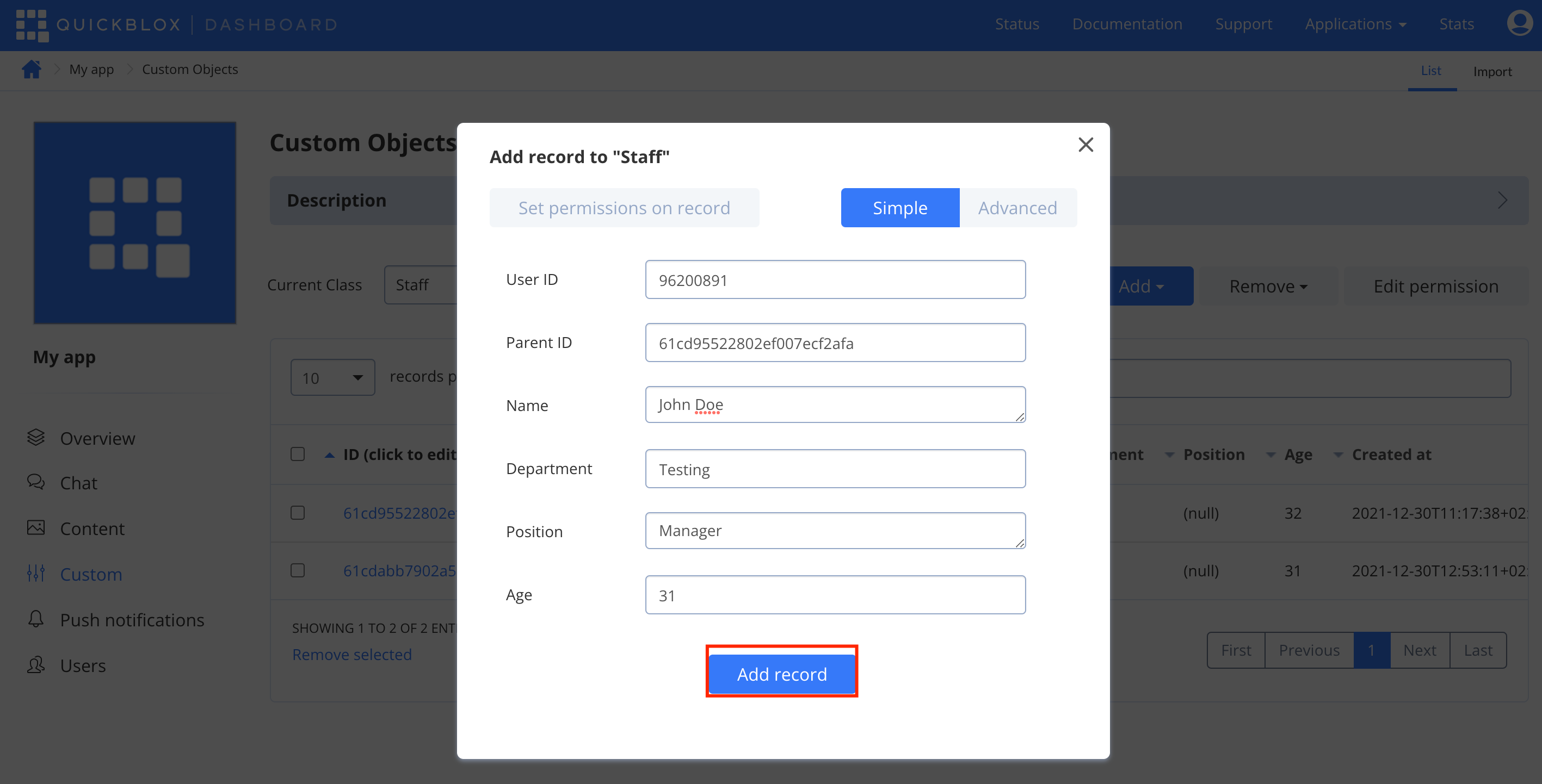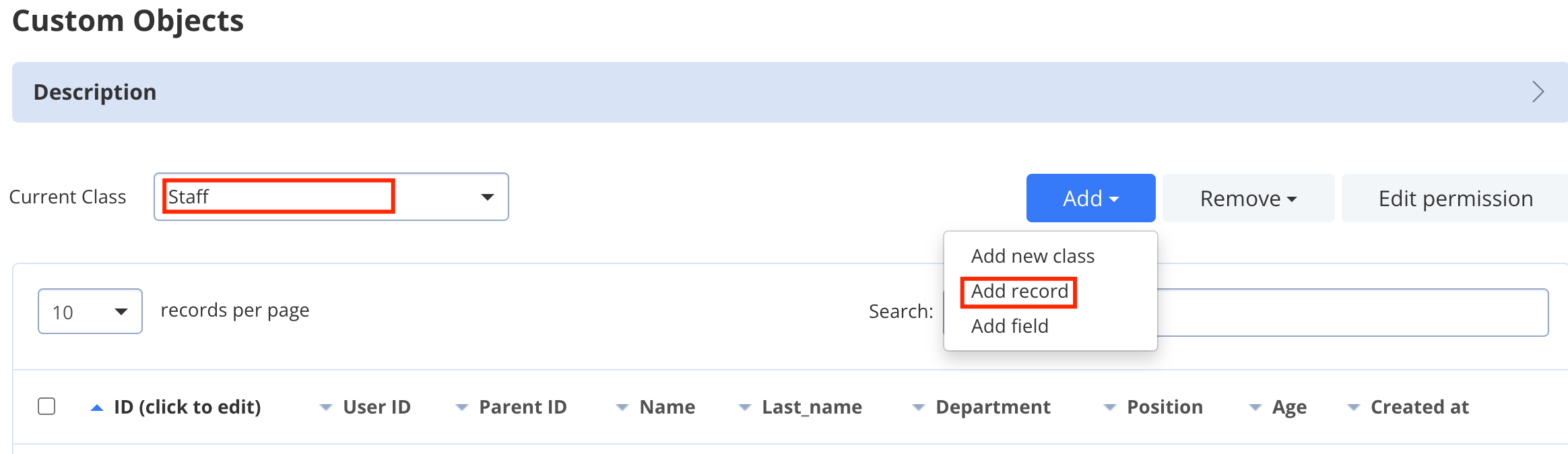 To add a custom object record, follow the steps below:- Navigate to the Dashboard => YOUR_APP => Custom page.