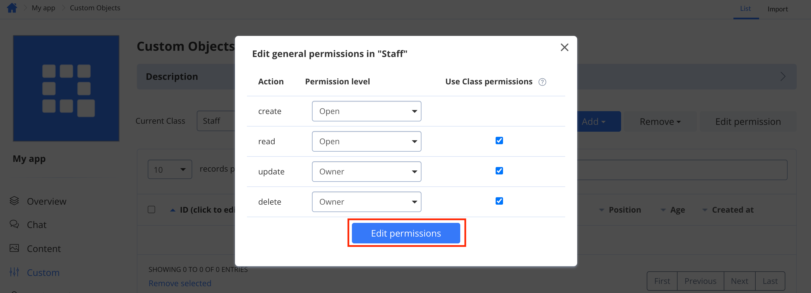 - Check the boxes in Use Class permissions if you want to apply class permissions to all its records.