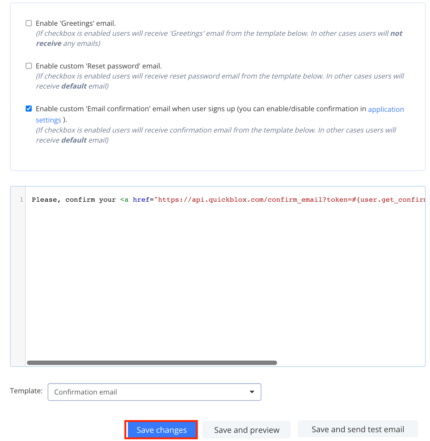 If the Enable custom ‘Email confirmation’ email is not checked, the users will receive a default QuickBlox email.
