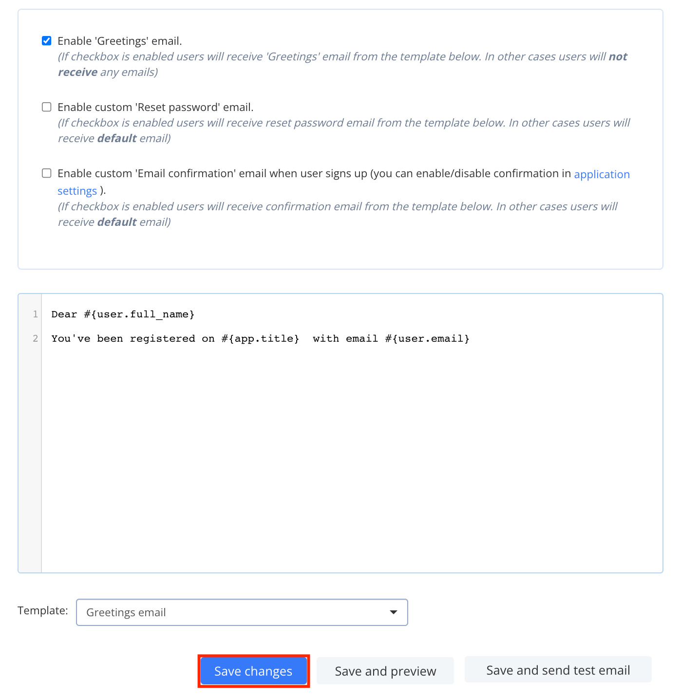 - Click the Save changes button. You can also click the Save and preview or Save and send test email option to preview or test the email template.