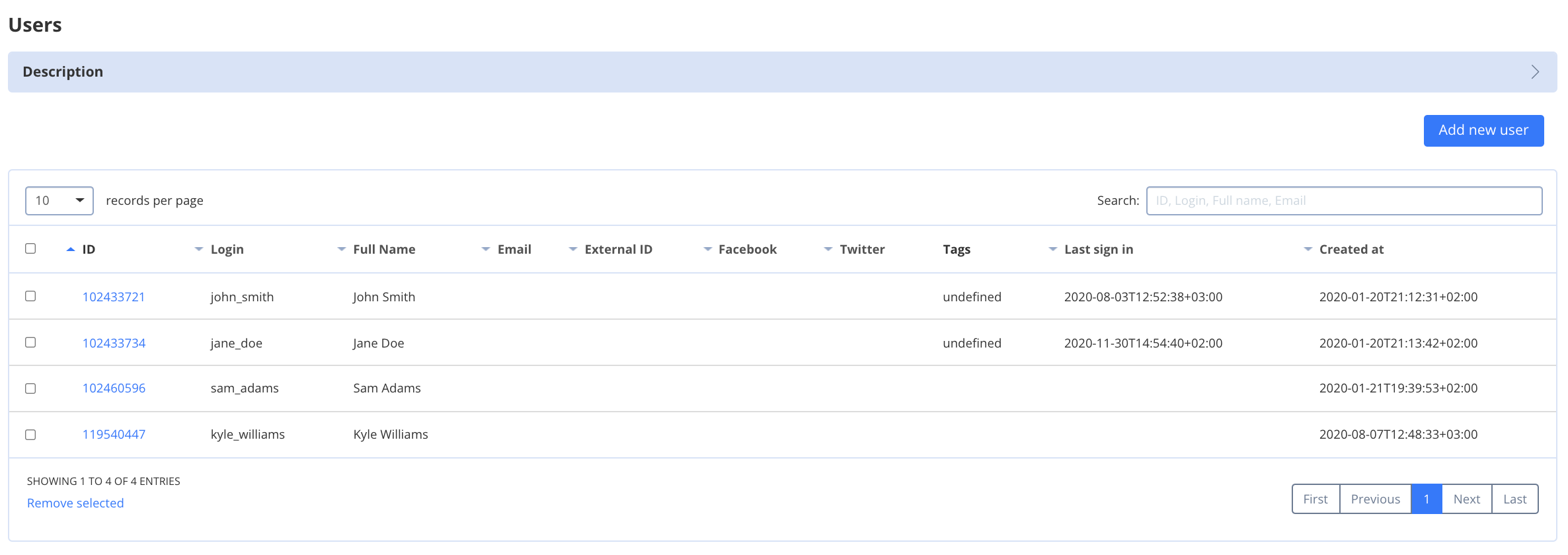 To list users, follow the steps below:- Navigate to the Dashboard => YOUR_APP => Users page. Here you will see a list of all existing application users.