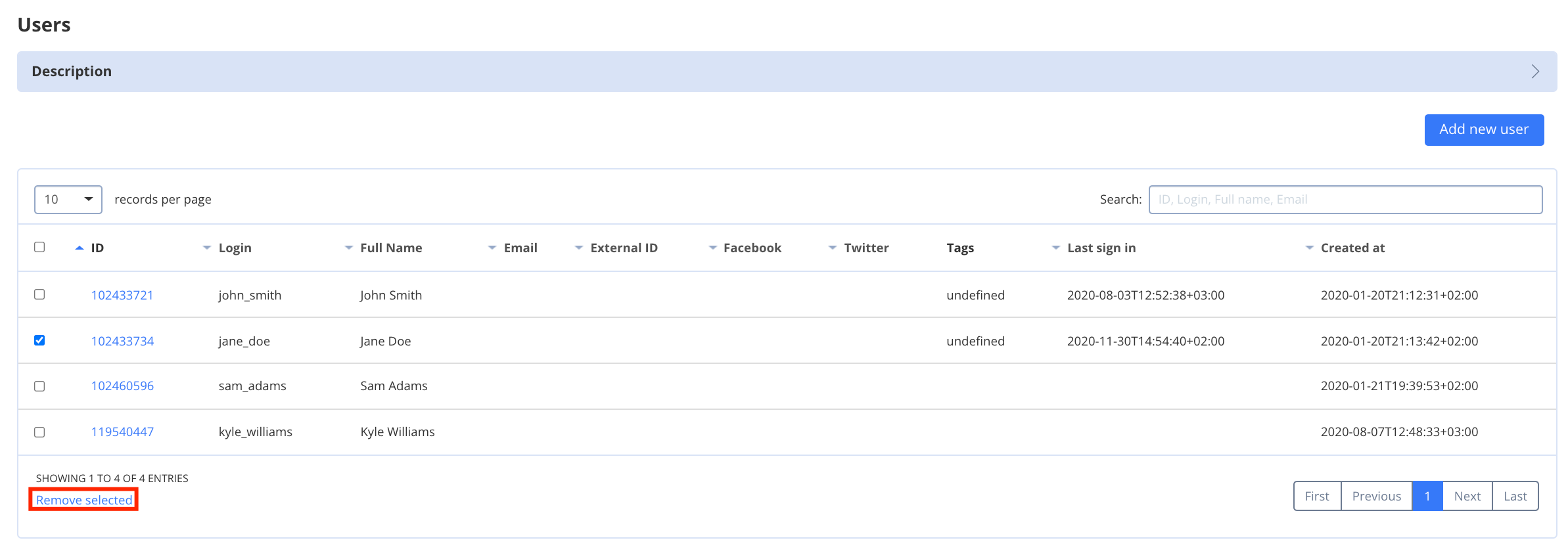 To delete a user, follow the steps below:- Navigate to the Dashboard => YOUR_APP => Users page. Here you will see a list of all existing application users.