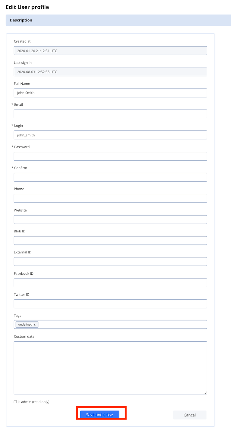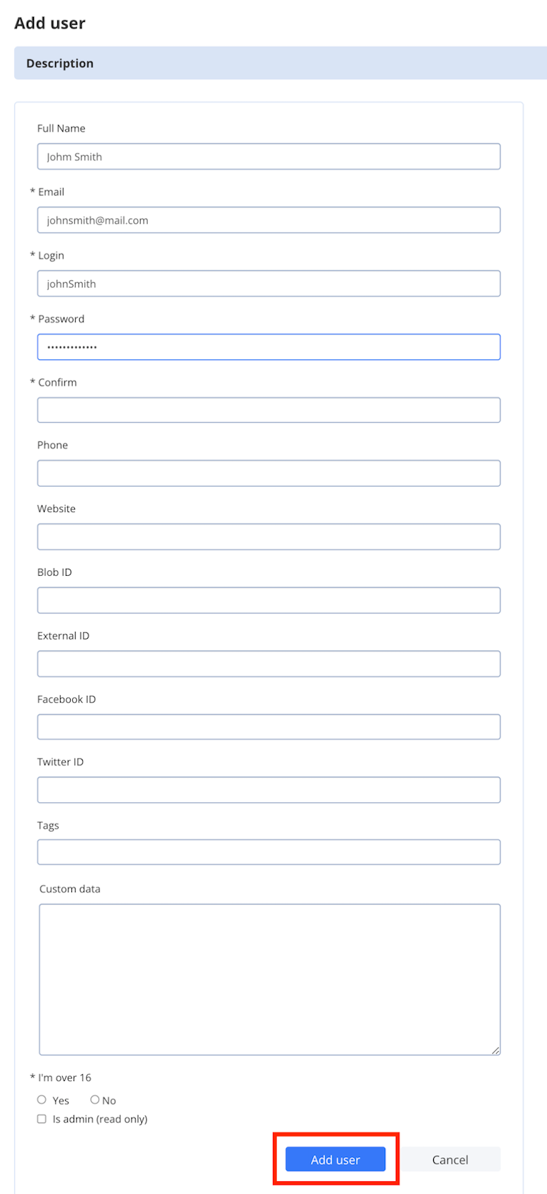 - Fill in the Add user profile info. Enter the email/login, password, and confirm the password for the new user account. These parameters are required for creating a user.
