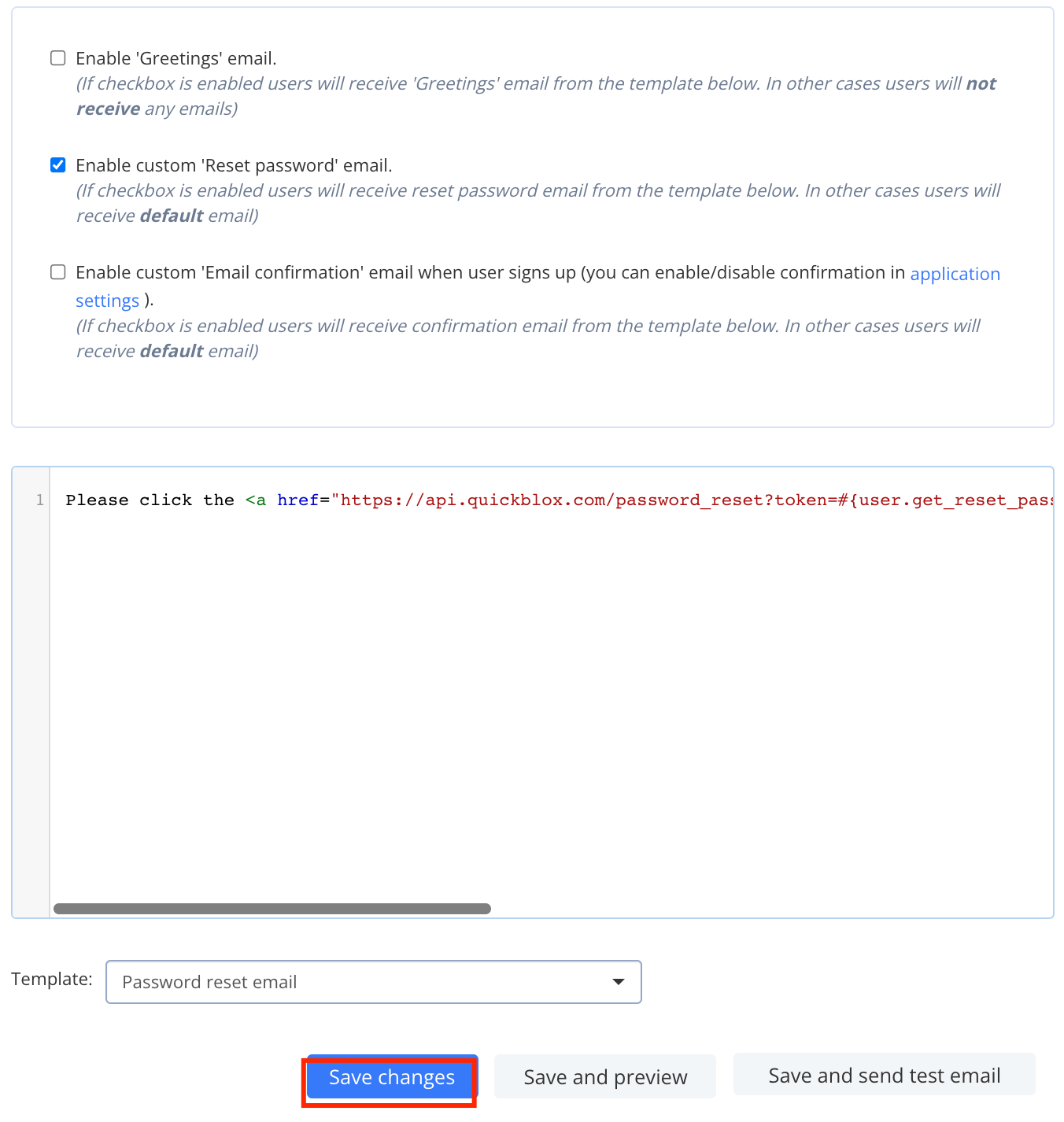 . Thus, when the user clicks on the emailed link, the token is going to be sent back to the application as part of the URL. - Click the Save changes button. You can also click the Save and preview or Save and send test email option to preview or test the email template.