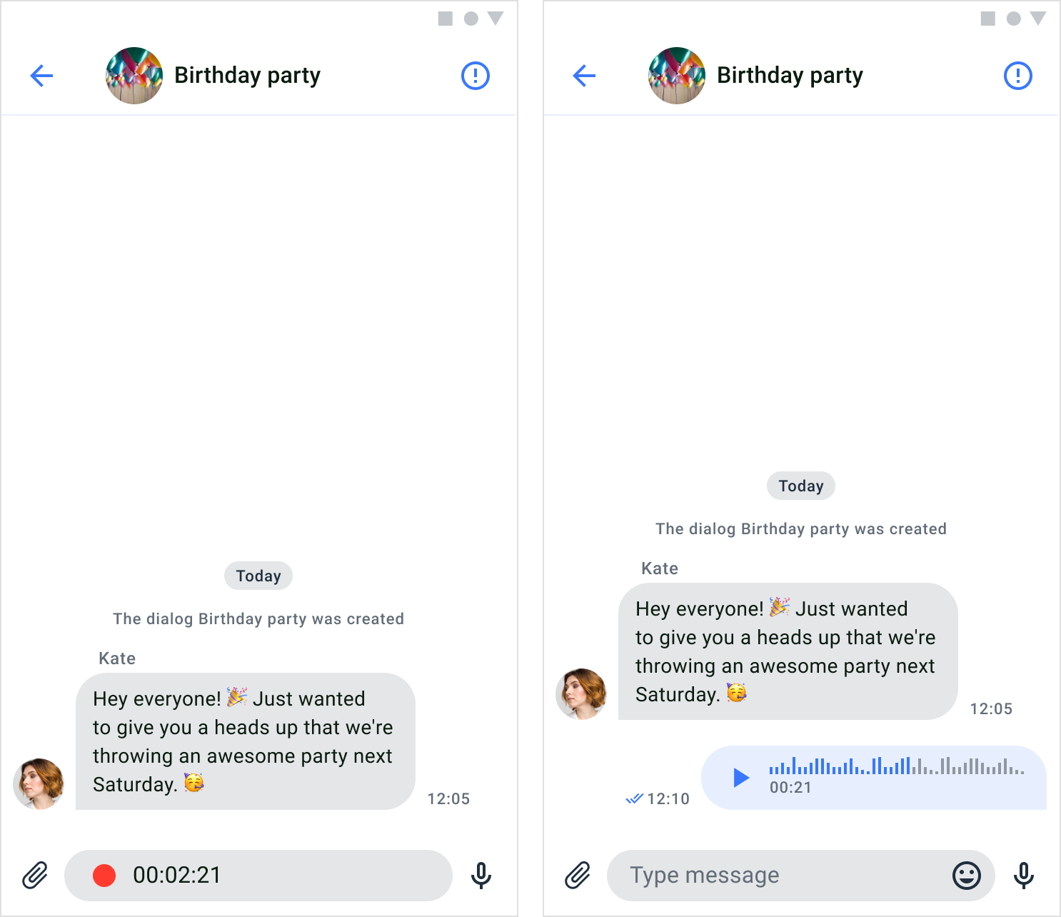In order to send a voice message, users have to record a message first. By default, a voice message icon is visible on the right side of the input field. While the icon is pressed, the voice recorder appears and recording the sound from microphone. The voice message icon appears only when input text form is empty. When the icon unpressed the voice message will send automatically.
