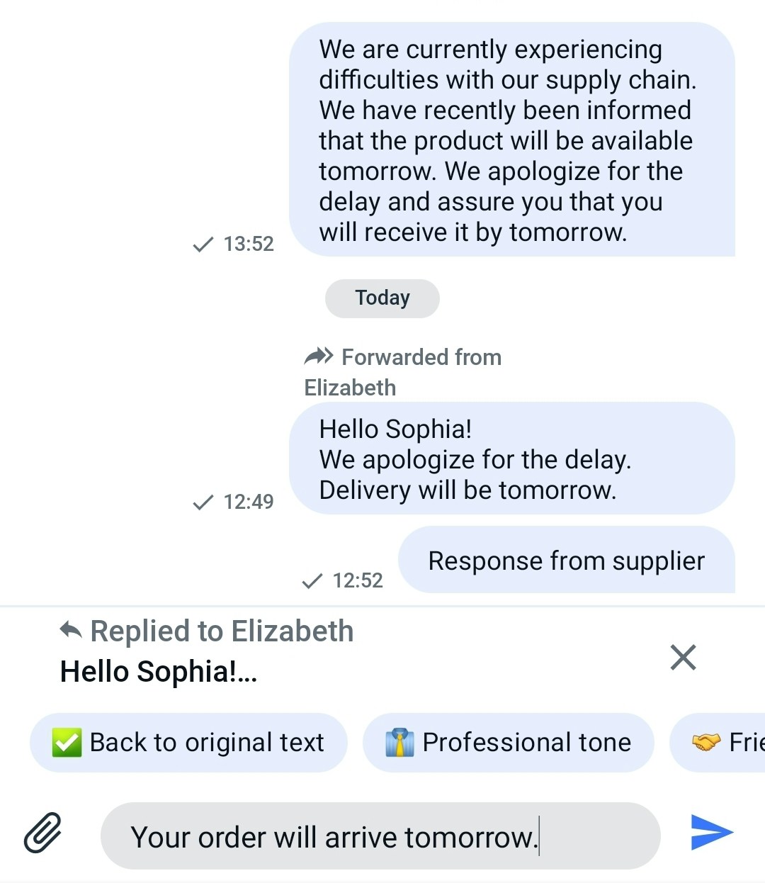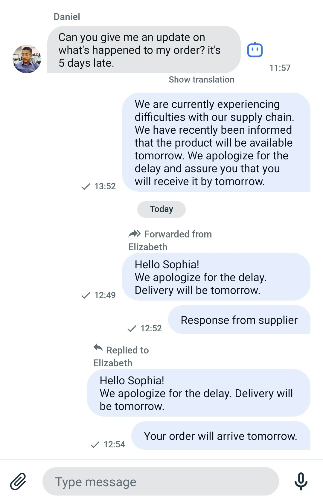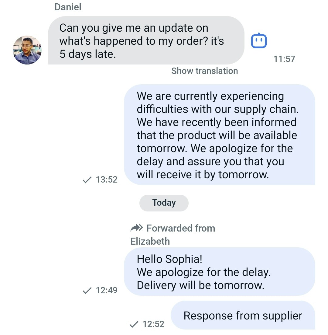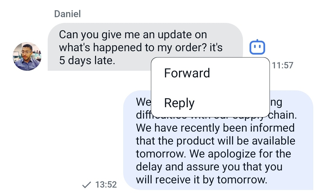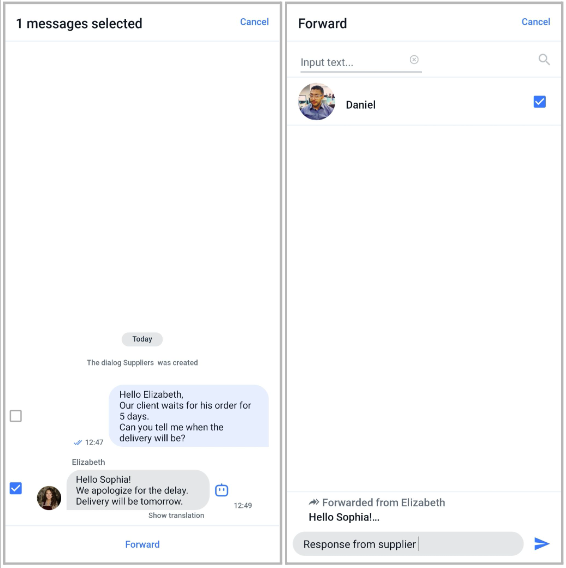 Once you’ve selected the dialogue to which you want to forward the message, the forwarded message will be displayed in the selected dialogue like this.