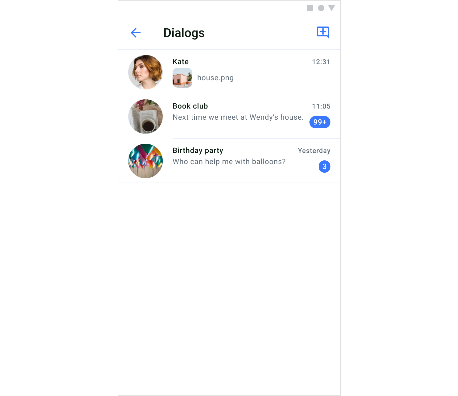 Unread message count is a feature that informs users of the number of messages they haven’t read in each dialog. The number of unread messages per dialog is displayed below the timestamp. If the number of messages is more than 100, it will be displayed as 99+. The unread message count appears on the DialogsComponent.