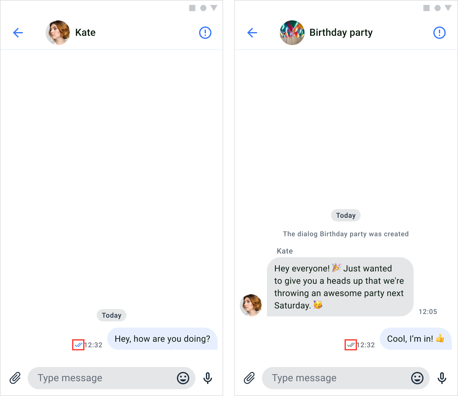 The read receipt feature allows users to determine whether their messages have been read by others in the dialog. When any recipient in the dialog have read the sender’s message, a colored double-tick icon is displayed next to the message’s timestamp. The read receipts are only visible to the sender of the message. It appears on the MessagesComponent.