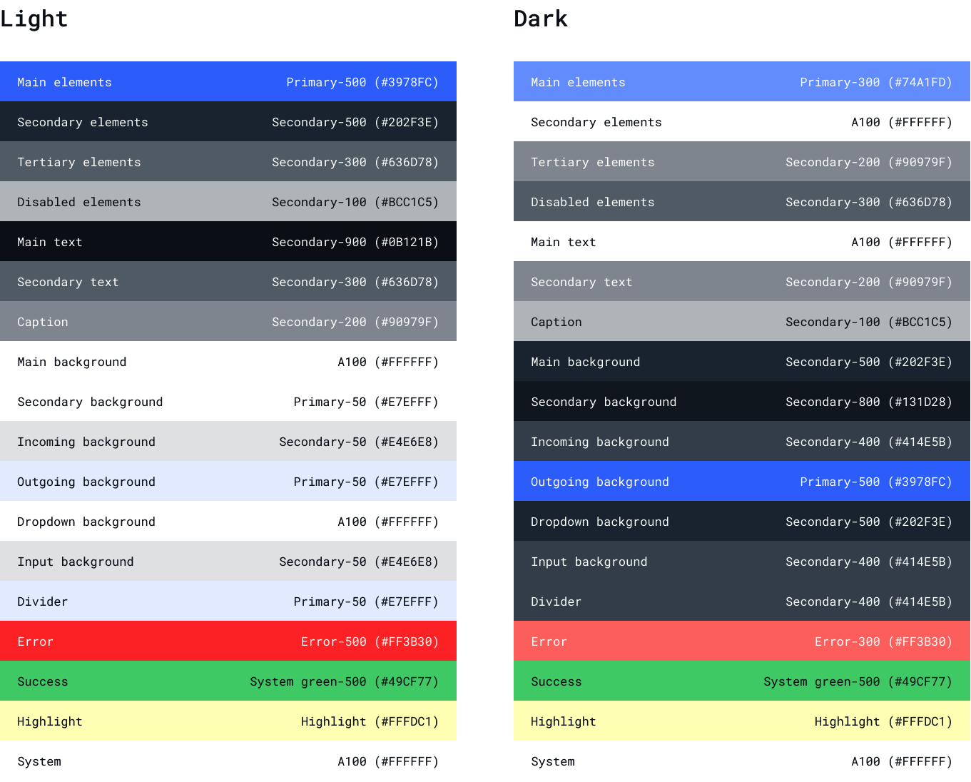 The QuickBlox UIKit for React has 2 built in themes: Dark and Light.Color Theme